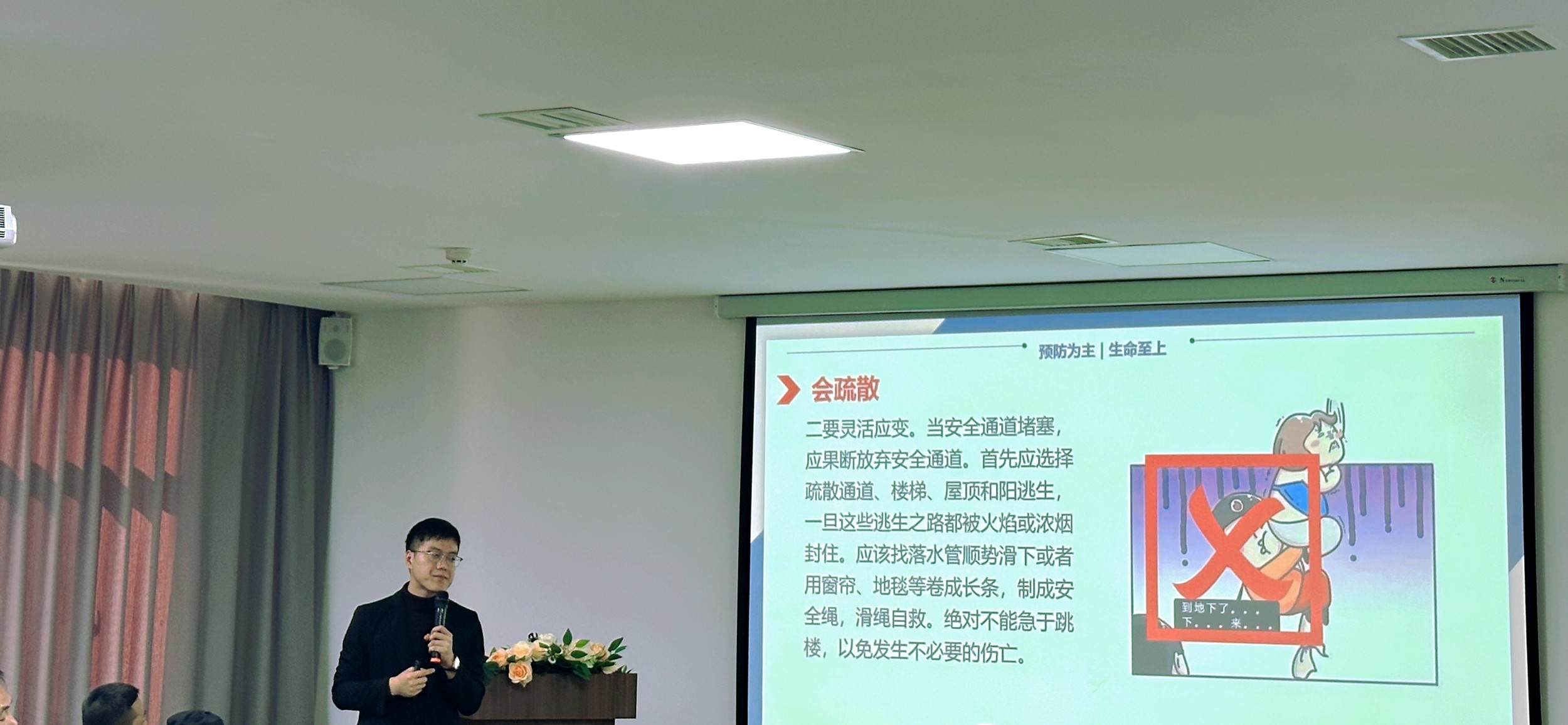 為達到火警疏散演練預期效果,會議最后對參會人員重點進行疏散培訓及注意事項要求,掌握應急“火災”發(fā)生是采取正確的防護措施和方法,提高緊急避險、自救自護和應變能力。