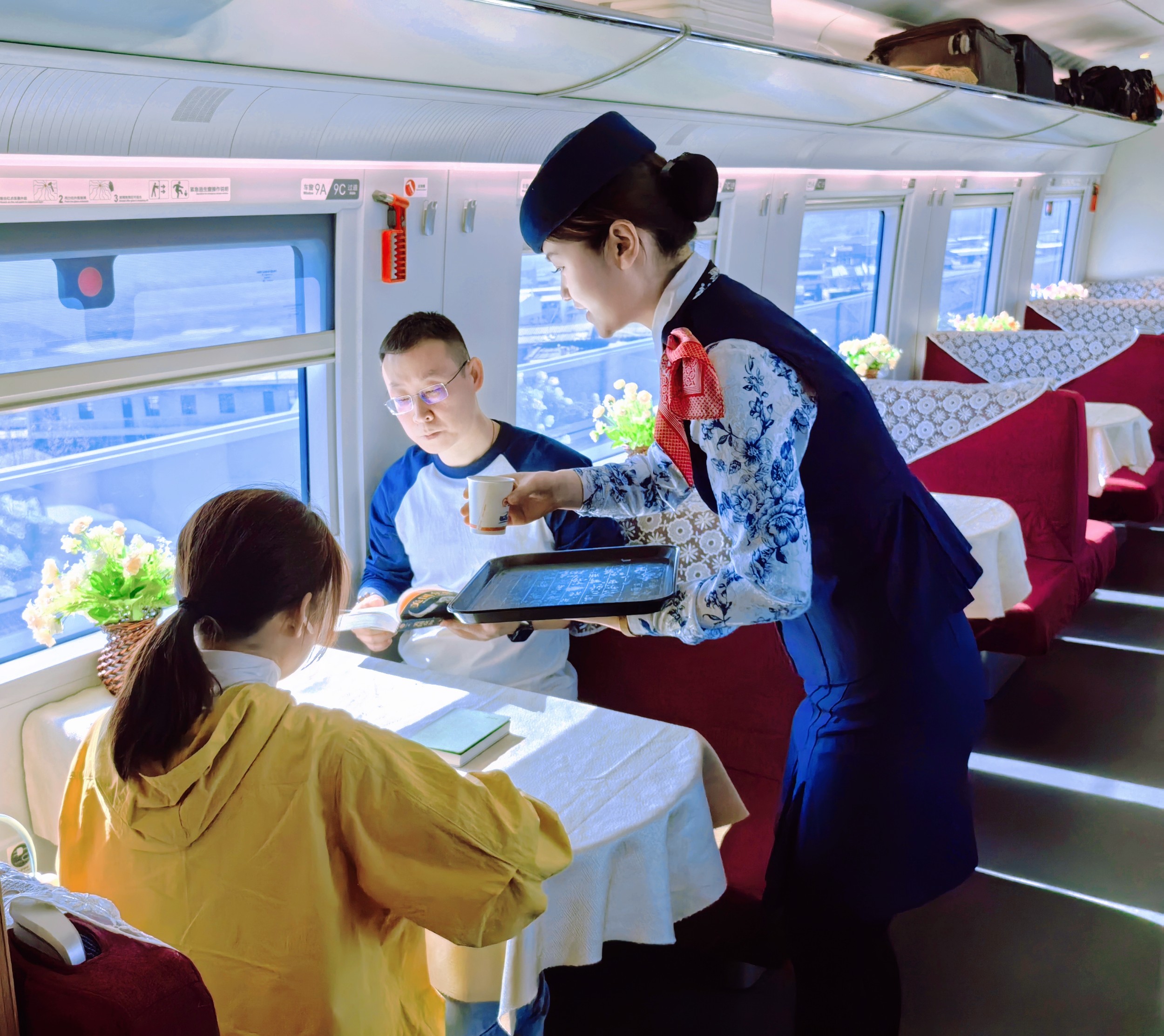 隨著列車的飛馳,張紫薇忙碌的身影在車廂內(nèi)穿梭。她熱情地為旅客們提供各類餐食服務(wù),并與他們分享著家鄉(xiāng)的風(fēng)土人情和油菜花海的美麗。她的笑容和熱情,讓旅客們感受到了家的溫暖和旅途的快樂(lè)。